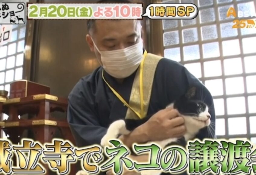 2/20 22:00~BS朝日「ネコいぬワイドショー」に出演しました。保護猫支援御朱印や、てらねこ譲渡会のことを取材していただきました。