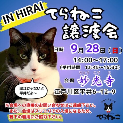 9月28日(日)てらねこ譲渡会in平井 開催のお知らせ